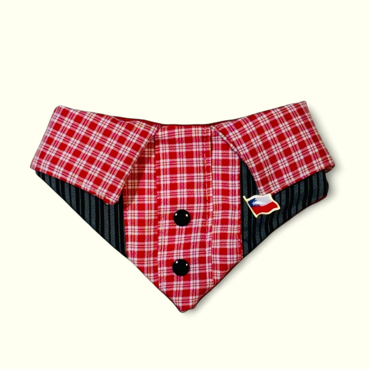 Nuestra bandana de huaso campestre está inspirada en los looks más tradicionales del campo chileno: rayas sobrias, detalles rústicos y ese aire criollo que enamora. Confeccionada en tela resistente de estilo camisa, esta bandana combina lo clásico con lo funcional. El pin con la bandera y los botones decorativos le dan un toque auténtico, ideal para peludos que llevan la patria en el pecho.