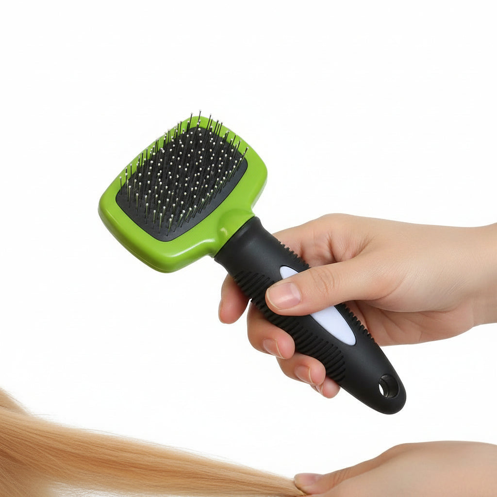 Diseñado pensando en la comodidad del dueño, cuenta con un mango ergonómico y antideslizante que te permite un control total y seguro, incluso en pelajes densos o rizados. Este cepillo no solo desenreda, sino que también elimina la suciedad superficial y ayuda a distribuir los aceites naturales del manto, logrando ese brillo sedoso que tanto nos gusta. Es el mimo extra ideal para el cuidado diario de todas las razas, asegurando que tu compañero luzca siempre impecable y se sienta ligero.