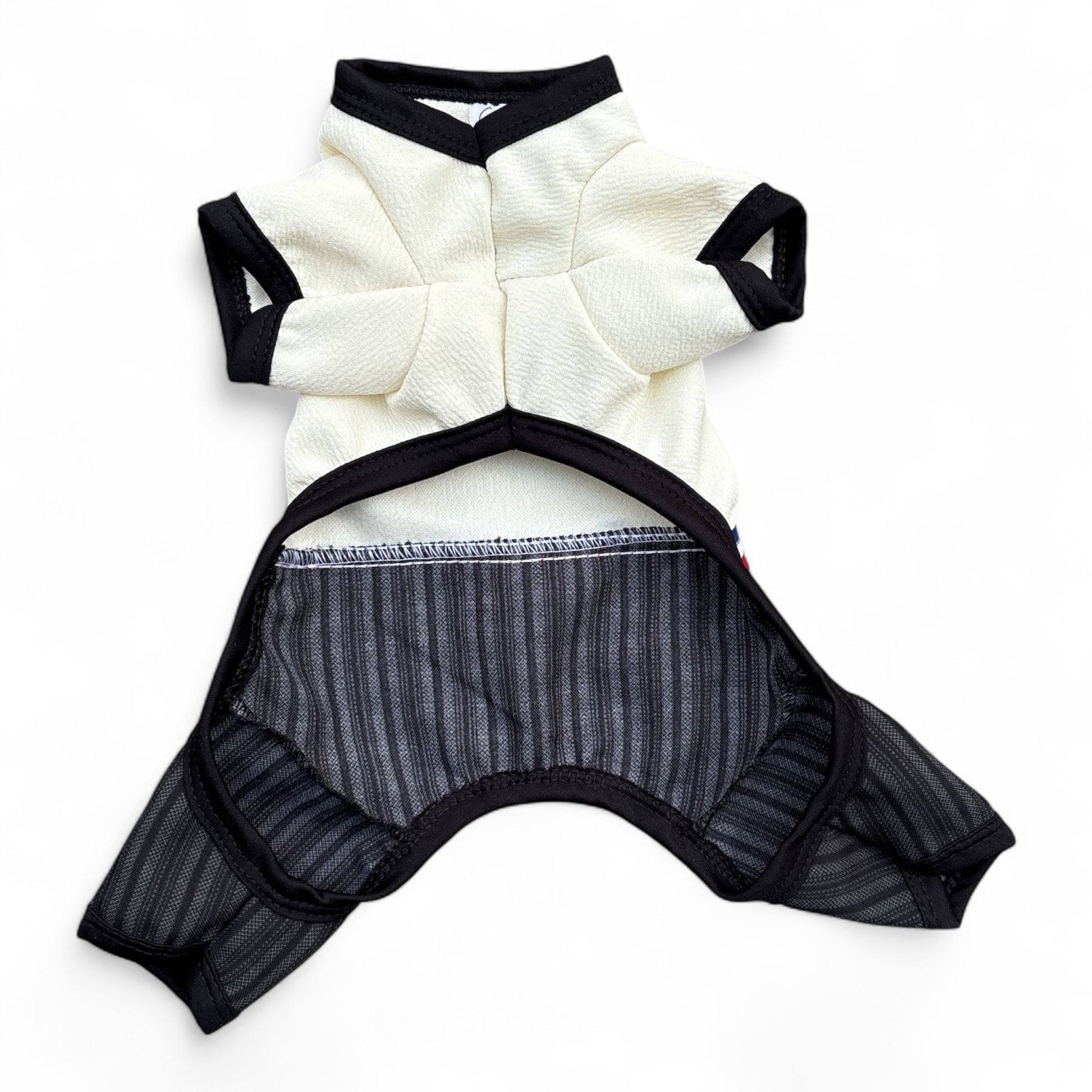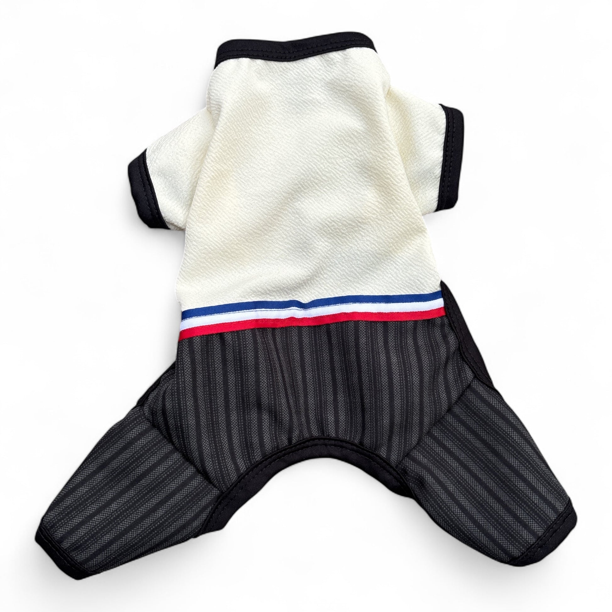 ¡Para el galán de la fonda que camina en cuatro patas! 🐶🤠 Este enterito de huaso elegante es la mezcla perfecta entre tradición y estilo. Con su camisa blanca de cuello negro, detalles tricolores al cinturón y pantalón oscuro con finas líneas verticales, tu perrito se transforma en todo un caballero chileno listo para zapatear.