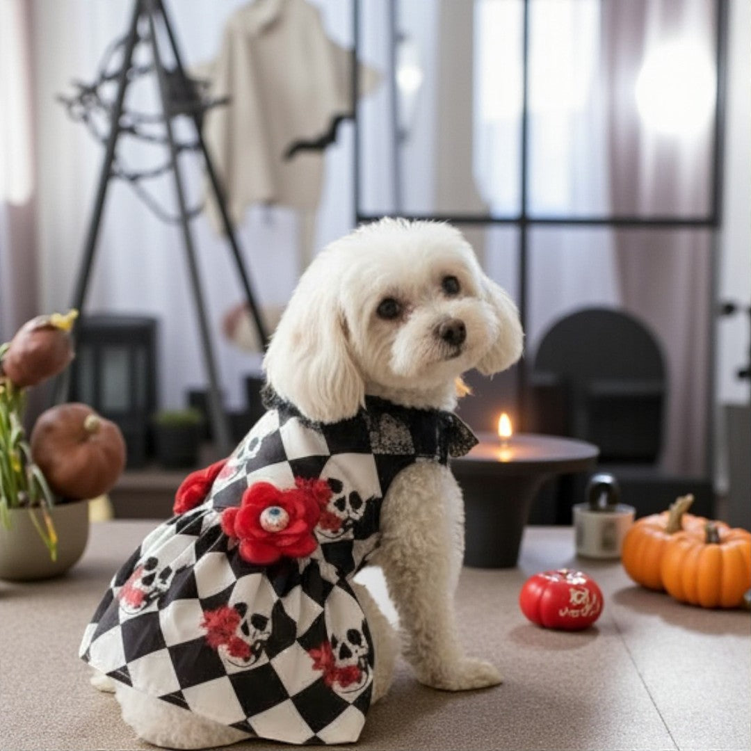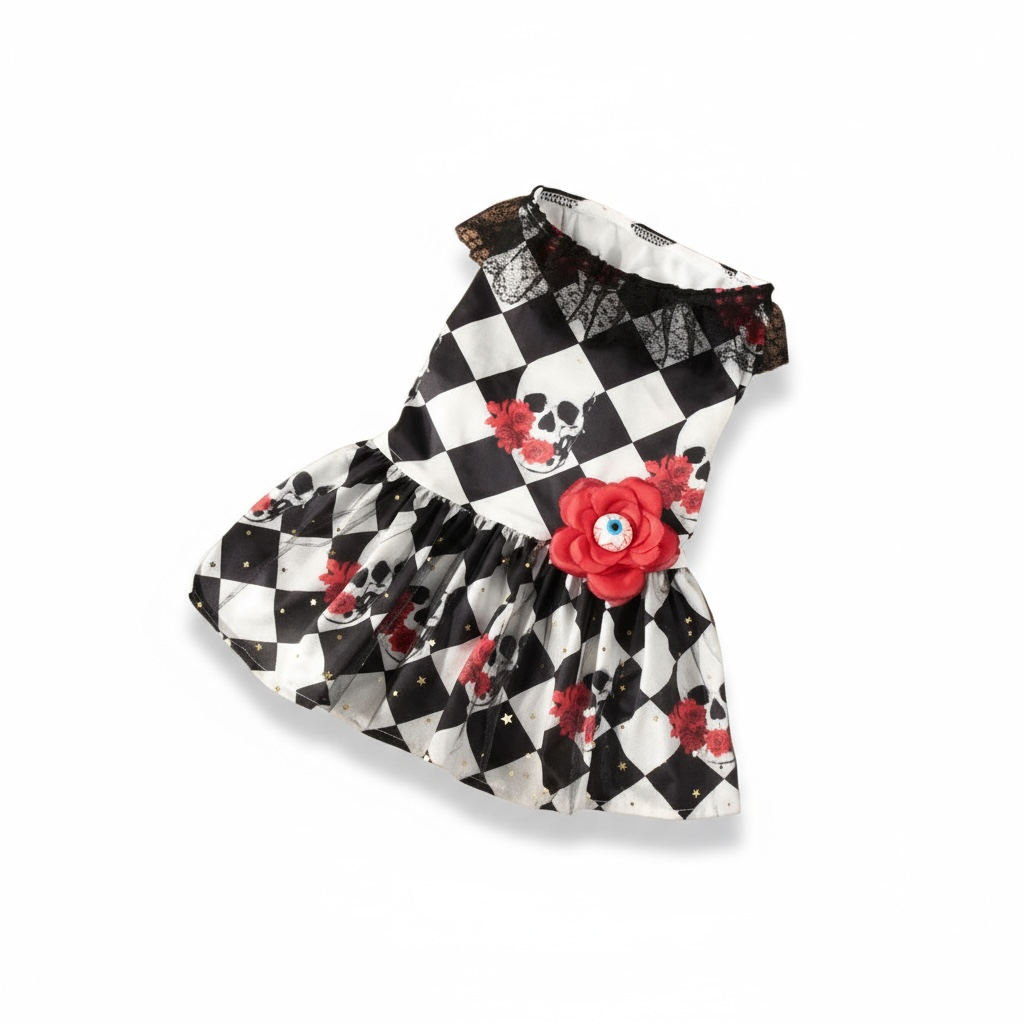 ¿Tu peludo tiene ese estilo que mezcla lo spooky con lo sofisticado? Con el vestido “Calaveras & Rosas”, se convierte en la estrella más elegante del Halloween. Este diseño combina estampado de rombos con calaveras y rosas rojas, encaje negro en el cuello, tul con estrellas doradas en la falda y una flor roja con ojo azul que le da el toque final de dramatismo.